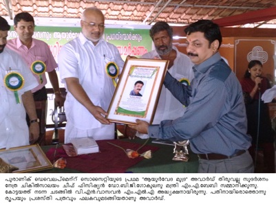 - AYURVEDA MUDRA" award instituted by Puranic Development Society, Kerala