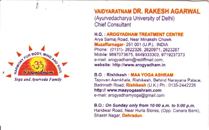 Vaidyaratnam Dr. Rakesh Agarwal is a widely renowned Ayurvedic Doctor of Western UP & Uttranchal. After passing Bachelor of Ayurvedic Medicine & Surgery (B.A.M.S) degree from University of Delhi in 1981, he came into the Medical Profession and joined his father Late Vaidya Sh. V.C. Agarwal at Arogyadham Ayurveda Treatment Centre, Muzaffarnagar. He has many happy patients in his 32 years of journey as a Sexologist & Chronic Disease Expert.
