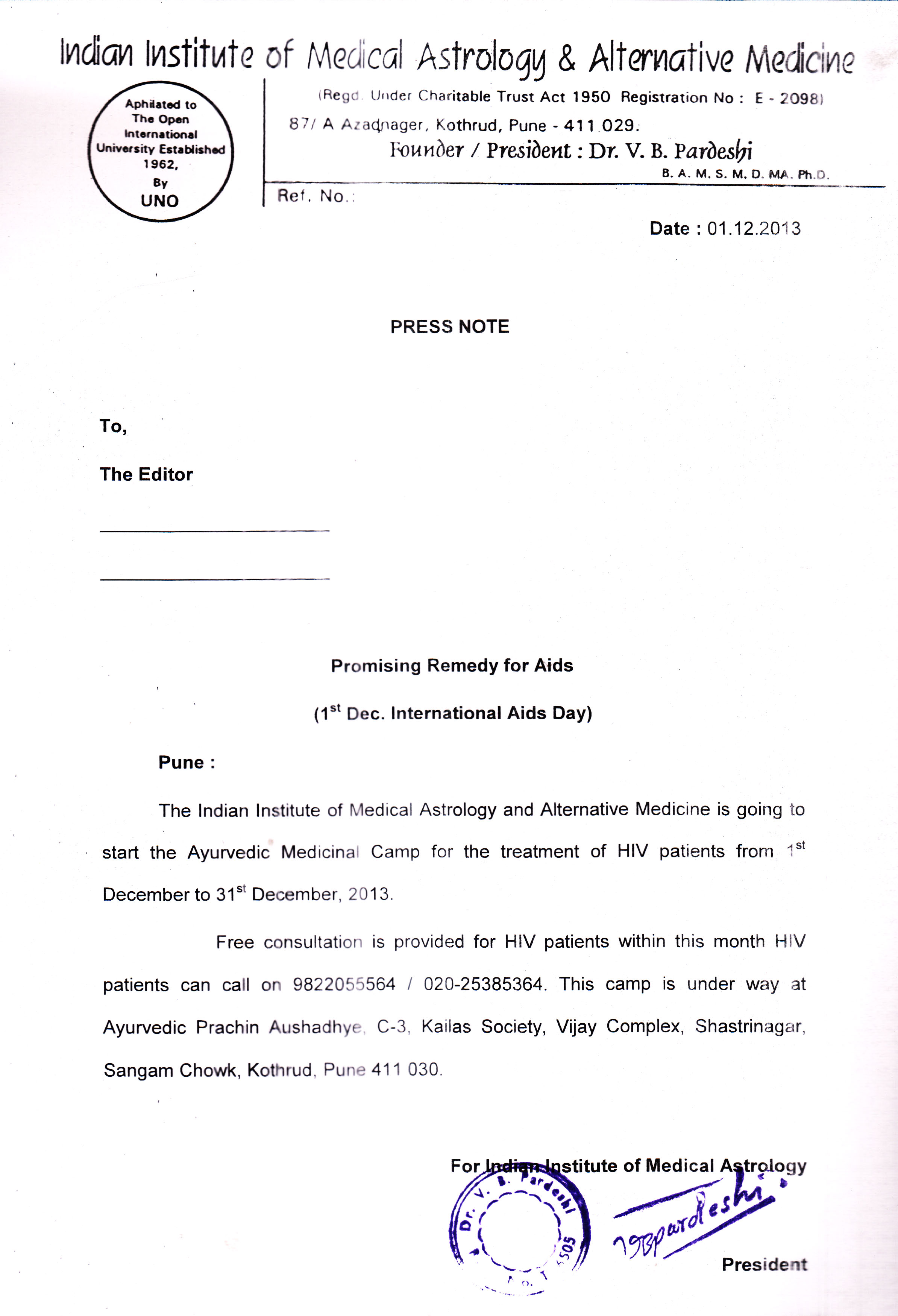 - Dr.V.B. Pardeshi is a Consaltant at Indian Institute Of Medical Astrology & Alternative Medicines, Pune