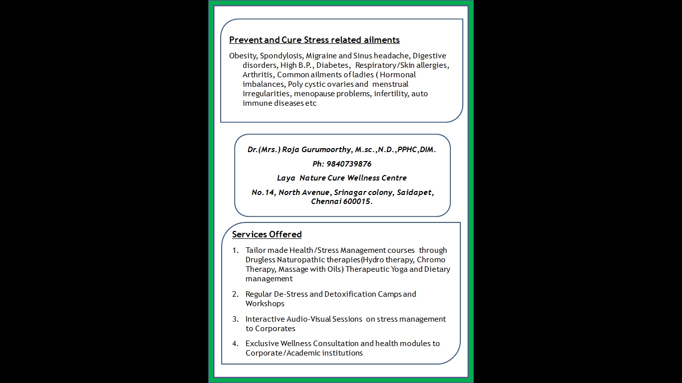 - Effective and permanent cure for chronic, stress induced ailments like Hypertension, Diabetes Mellitus, Obesity, Arthritis, Respiratory and Skin Allergies, Digestive Disorders, sleeplessness, Cervical and Lumbar Spondylitis, Sinus and Migraine headache, and Common ailments of ladies through Drugless Naturopathic therapies, therapeutic Yoga and Dietary management